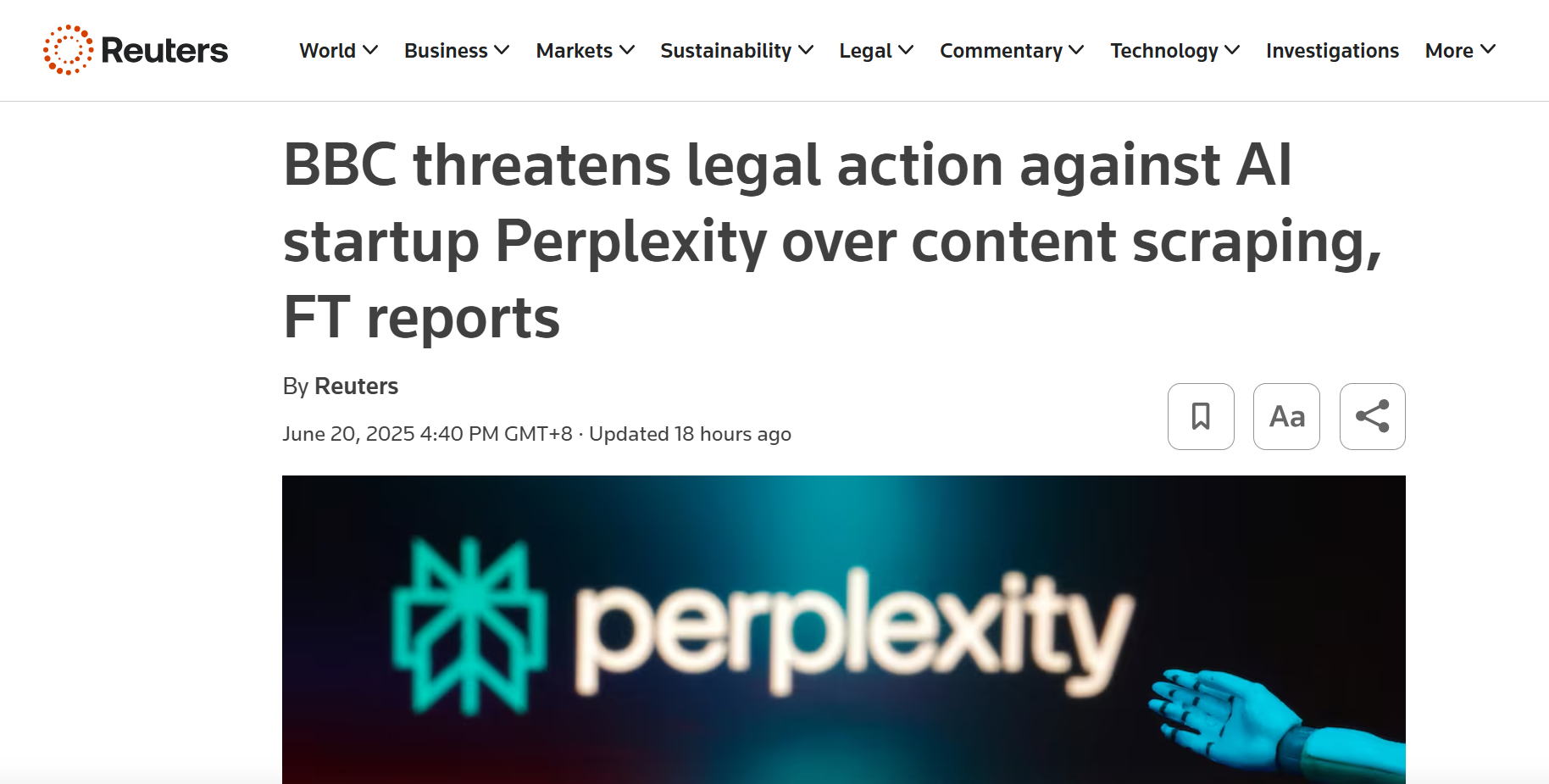 據《金融時報》獲取的一封致Perplexity首席執行官阿拉温德·斯里尼瓦斯的信函顯示,BBC表示掌握證據,指出Perplexity的“默認AI模型”曾使用BBC內容進行訓練。BBC在信中要求Perplexity立即停止抓取其所有內容,刪除為開發AI系統而保存的全部資料副本,並就涉嫌侵犯知識產權行為提出賠償方案,否則將考慮申請法院禁令。