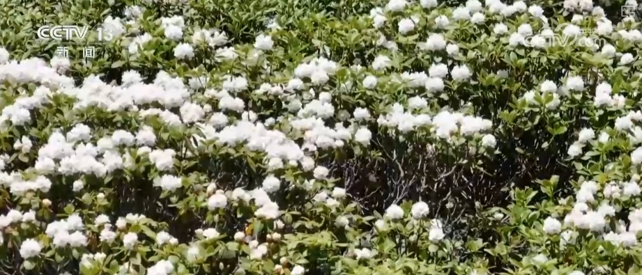 而到達山頂之後會看到另一番景象。漫山遍野的高山杜鵑迎風怒放,白色的花簇呈現出旺盛的生命力。這些花朵花期在兩個月,初期盛開時與皚皚積雪相伴。