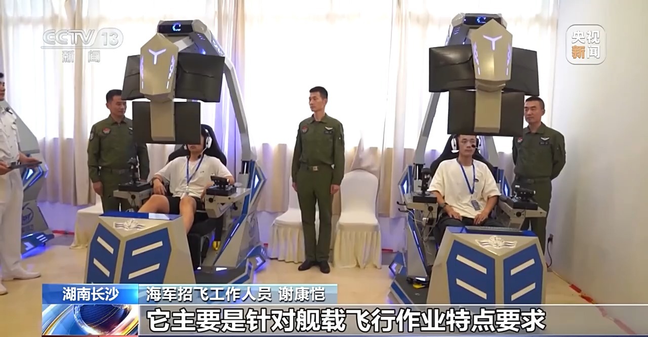 *海軍招飛工作人員 謝康愷:*現在大家看到的這套系統就是海軍招飛的專屬的艦載飛行潛質檢測項目之一,它主要是針對艦載飛行作業特點要求,模擬特定條件下身心的負荷情境,採用主動對抗還有被動干擾等形式,通過對任務績效、應激抗壓和載荷參數等指標進行綜合評價,主要考查這些招飛對象空間定向、注意力集散、壓力應對、精準操控以及情緒調控等相關艦載飛行潛質。