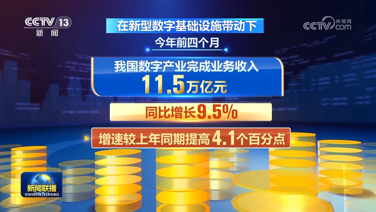 在新型數字基礎設施帶動下,今年前四個月,我國數字產業完成業務收入11.5萬億元,同比增長9.5%,增速較上年同期提高4.1個百分點。