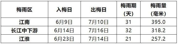 梅雨的開始和結束表現出顯著的時間和空間差異,多年統計結果顯示,首先是江南6月9日最先入梅,隨後是長江中下游6月14日入梅,然後是江淮6月23日入梅(下表)。江南和江淮差了有兩週左右的時間,這也反映了我國雨帶季節性向北推進的特點。通常江淮梅雨期間雨帶集中在我國長江中下游到淮河地區。江淮梅雨結束後,雨帶將進一步向北移至華北、東北地區。