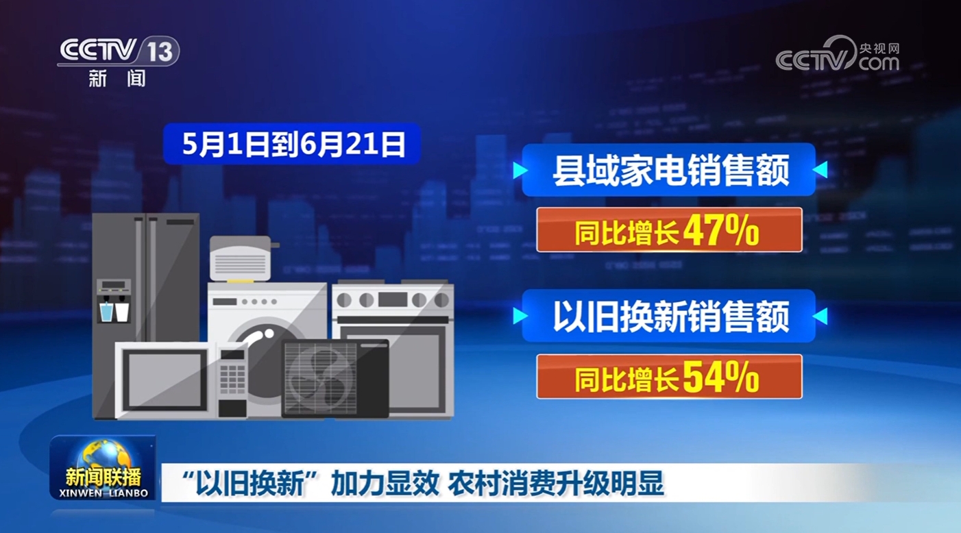 央視網消息(新聞聯播):眼下,全國縣域家電市場迎來了年中的銷售高峯。在“以舊換新”政策的推動下,農村市場活力進一步迸發,消費升級趨勢明顯。