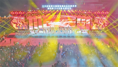 6月21日夏至日,漠河第三十五屆北極光節在北極村開幕。圖為中外遊客在欣賞節目表演。