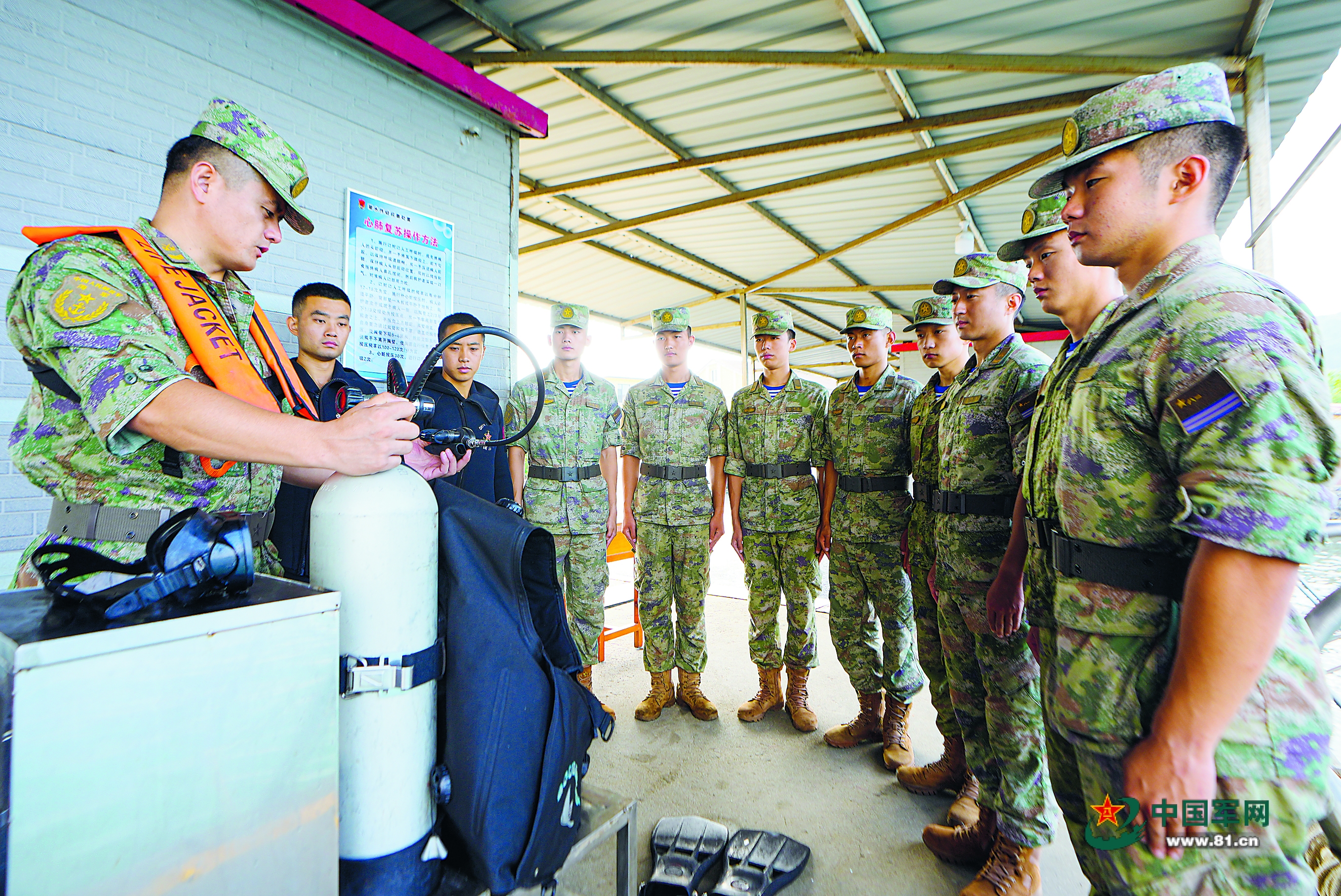 該中隊潛水戰位長張濤(左一)為潛水員講解裝備使用技巧。曹宏洋攝