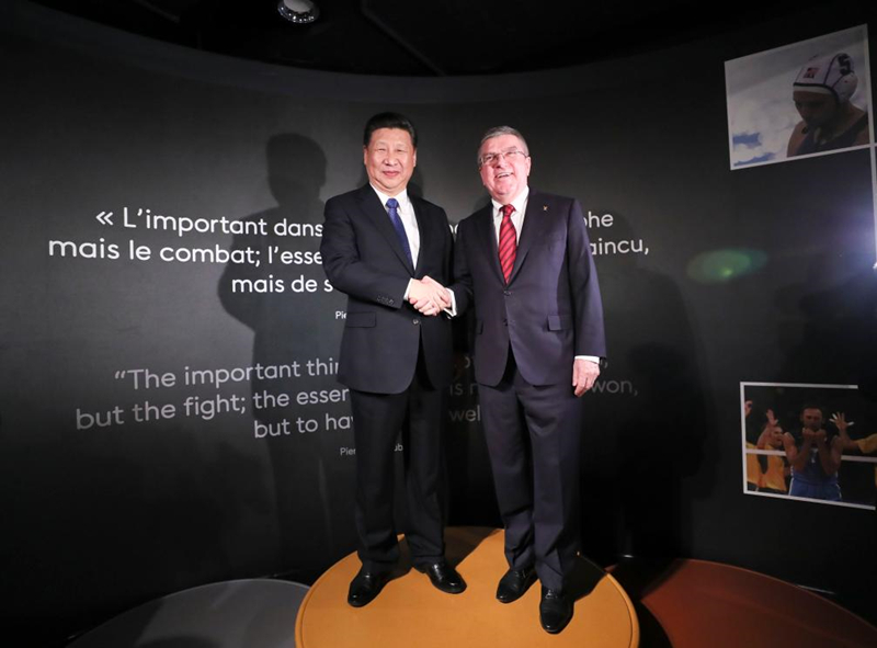 2017年1月18日,在位於瑞士洛桑的國際奧林匹克博物館內,巴赫陪同習近平主席參觀博物館展廳。中國奧運健兒的獎牌、比賽用具,北京奧運會火種點燃的老照片……一件件展品見證着中國與奧林匹克的深厚淵源。