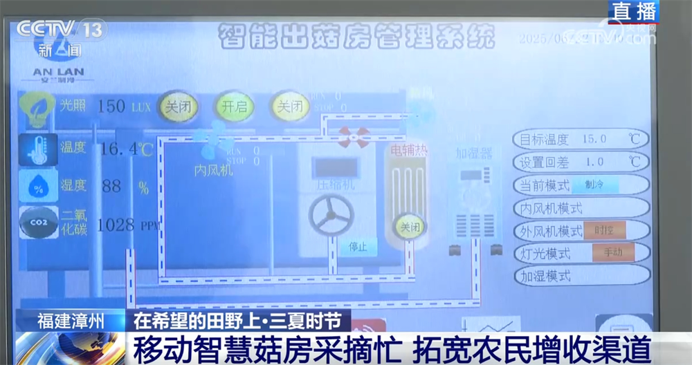 那“移動智慧菇房”的“智慧”又體現在哪兒呢?其實每個菇房都裝有自動控制系統,只要在這個面板上設置自動控制模式,菇房就可以對不同生長階段的菌菇所需的光照、温度、濕度、二氧化碳濃度等參數自動調節。