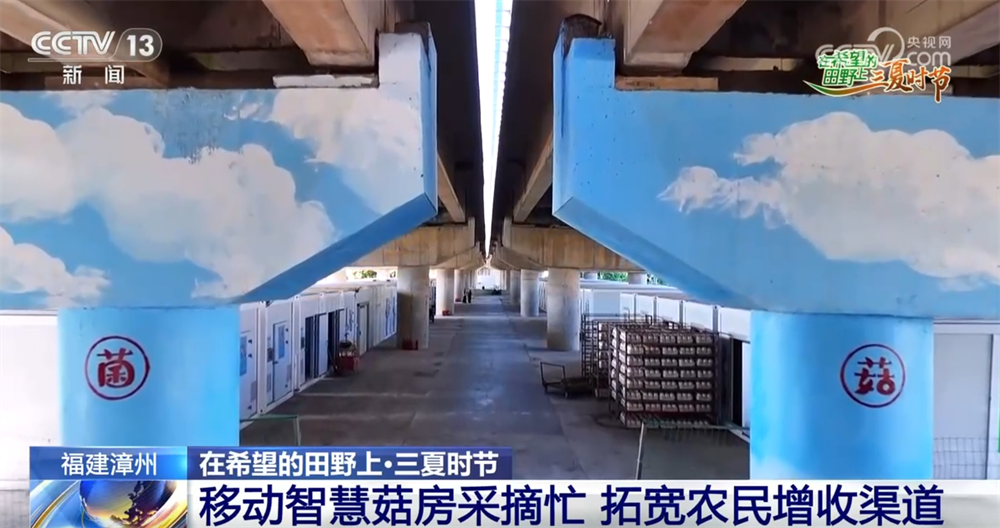 記者正在漳州市薌城區天寶鎮的百米菌菇示範基地。通過航拍畫面,我們可以看到周圍的環境,這裏在田寮村村口的一個高速高架橋下,兩邊是農田和住宅,橋下形成了閒置的空地。2023年開始,當地利用這塊空地建設起了“移動智慧菇房”,它們每個長8米、寬3米、高2.4米,外觀看上去就像是一個個集裝箱,可以整箱吊裝移動。在周邊村落房前屋後的閒置空地上,也能夠看到這些移動菇房的身影。