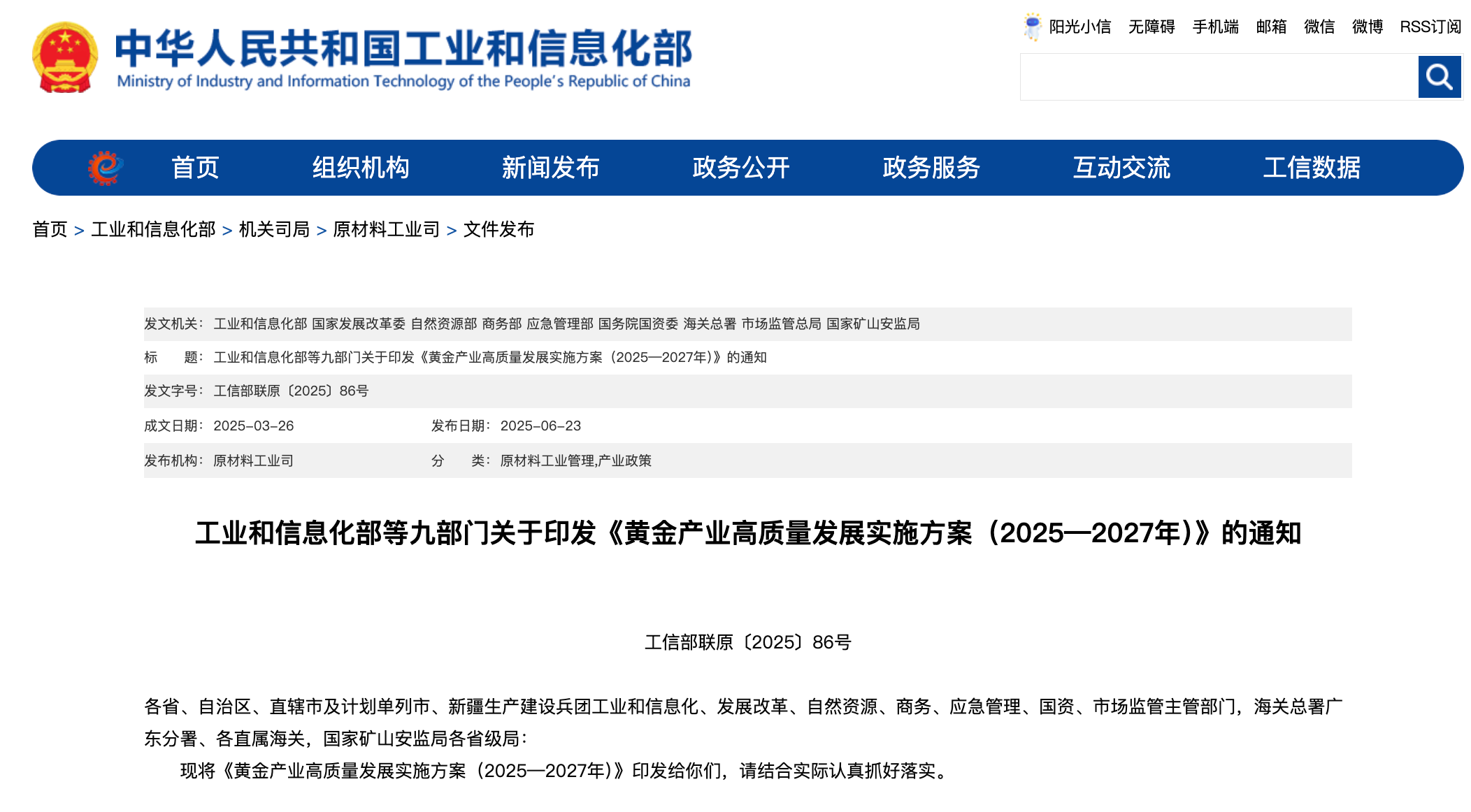 【環球網財經綜合報道】近日,工業和信息化部、國家發展改革委、自然資源部、商務部、應急管理部、國務院國資委、海關總署、市場監管總局、國家礦山安監局等9部門聯合發佈《黃金產業高質量發展實施方案(2025—2027年)》(以下簡稱《實施方案》)。《實施方案》提出,到2027年,黃金資源保障能力和產業鏈創新水平明顯提升。資源保障方面,黃金資源量增長5%-10%,黃金、白銀產量增長5%以上。