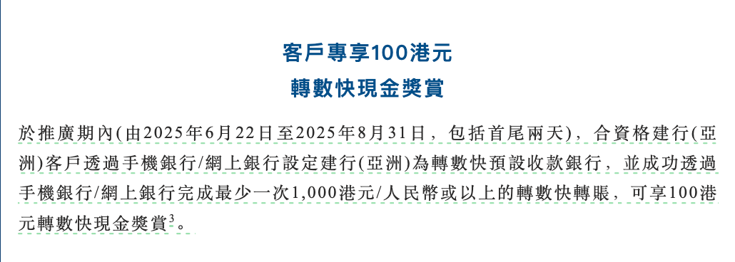 建銀亞洲還將在6月22日至8月31日推廣期內推出現金獎勵,客户設定建銀亞洲為轉數快預設收款銀行,併成功完成最少一次1000港元/人民幣或以上的轉數快轉賬,可享100港元轉數快現金獎賞。滙豐銀行表示,合資格的客户通過“跨境支付通”每次接收最少港幣1000元或人民幣1000元,有機會獲得10美元“獎勵金”,活動有效期至2025年9月30日。
