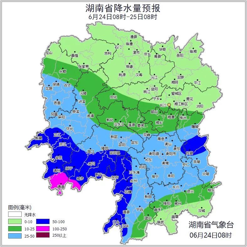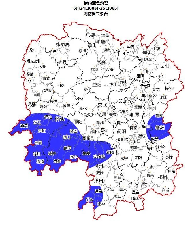 湖南省氣象台06月24日06時發佈暴雨藍色預警: