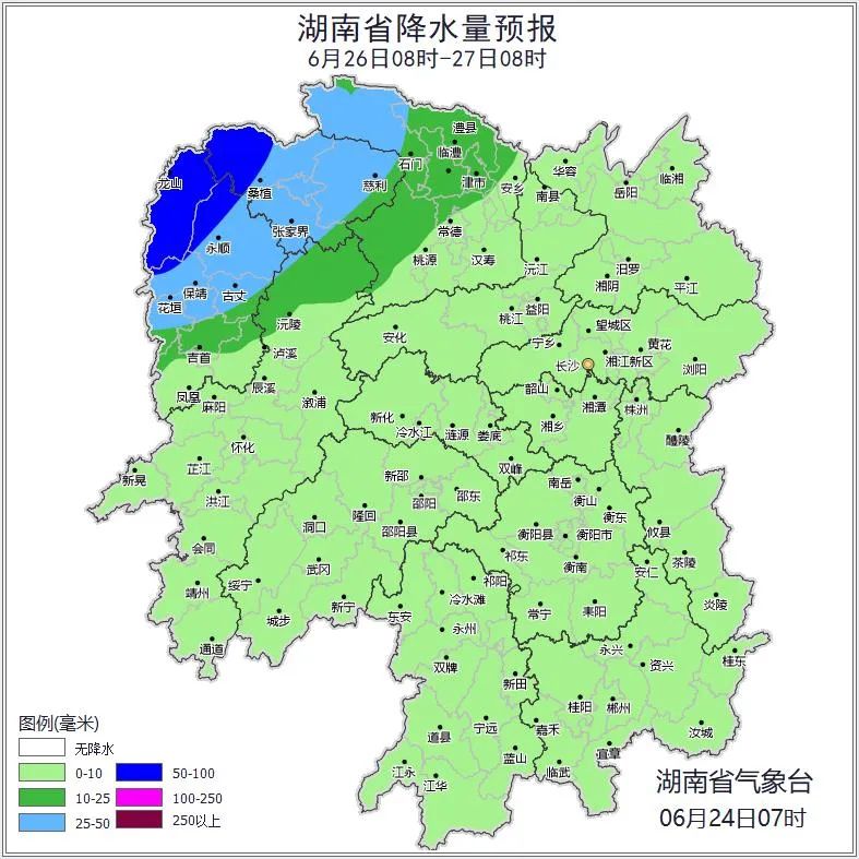 26日白天至晚上,湘西北陰天有中到大雨,其中張家界(桑植)、湘西州(龍山、永順、保靖)有暴雨,其他地區陰天間多雲,有分散性陣雨或雷陣雨;南風2~3級,雷雨時陣風7~9級;最高氣温湘中以南31~34℃,其他地區26~30℃,最低氣温22~26℃。