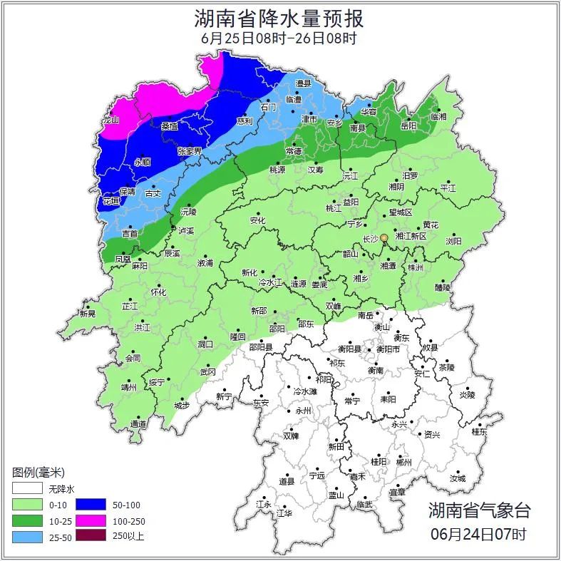 25日白天至晚上,湘西北陰天有大到暴雨,其中湘西州(龍山、永順)、張家界(桑植)、常德(石門)有大暴雨,其他地區多雲,湘中有小到中等陣雨或雷陣雨;南風2~3級,雷雨時局地陣風7~9級;最高氣温湘中以南31~34℃,其他地區28~30℃,最低氣温22~26℃。