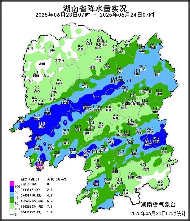 6月23日07時至24日07時,強降雨主要位於懷化中南部、株洲南部、衡陽、婁底西部、永州、郴州北部、益陽南部、長沙西部、邵陽等地,9市(州)35縣(市、區)168鄉(鎮)出現暴雨,懷化(通道)隴城鎮、坪坦鄉出現大暴雨,最大為通道隴城鎮118.6毫米;小時雨強最大為通道坪坦鄉66.8毫米(24日00時至01時);最高氣温湘南30~35℃,其他地區22~29℃,最低氣温湘南22~26℃,其他地區18~22℃。
