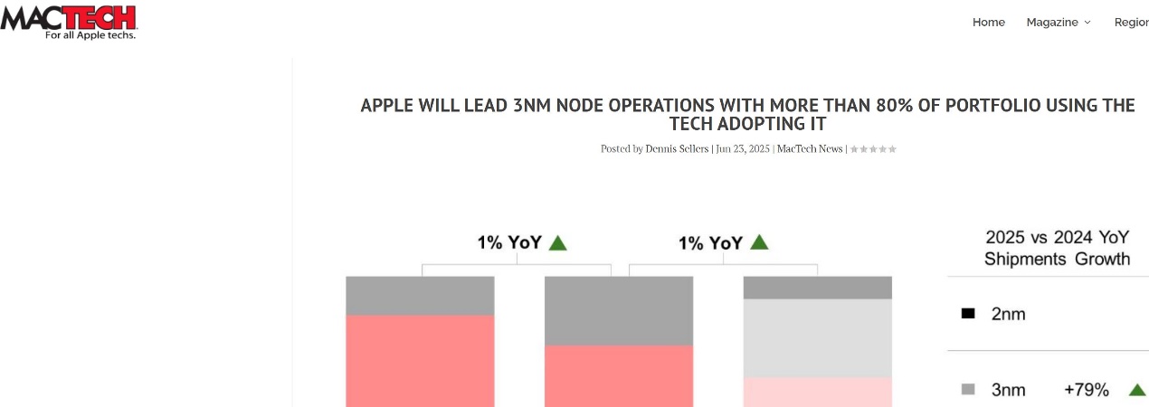 【環球網科技綜合報道】6月24日消息,據外媒mactech報道稱,Counterpoint Research公佈的最新數據顯示,蘋果將在2025年引領3nm節點技術的應用,預計超過80%的產品組合將採用這一先進工藝。