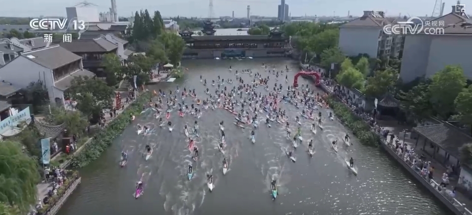 6月20日,第七屆南潯古鎮槳板公開賽開幕。帶上一隻槳、一塊充氣板,運動員們從“絲綢碼頭”出發,穿過小橋流水人家,擁抱藍天碧水青山。賽事活力從白天一直持續到夜幕降臨。
