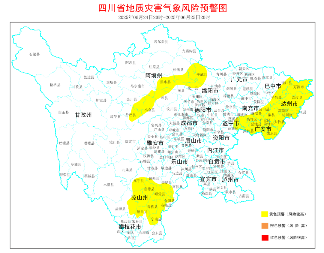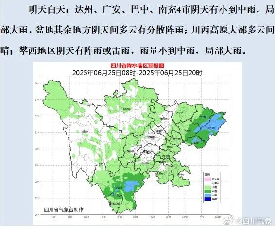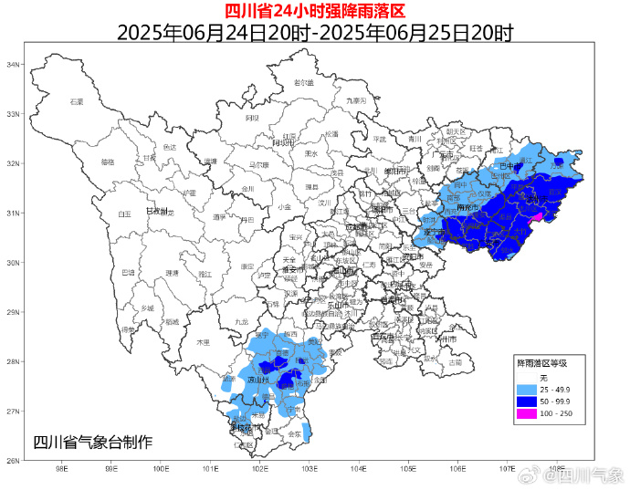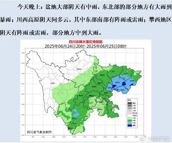 6月24日20時到25日20時:達州、廣安、巴中、南充、遂寧5市和攀西地區的部分地方有大雨到暴雨(雨量40~80毫米),個別大暴雨(100~120毫米),最大小時雨量20~40毫米。