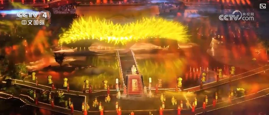 水霧升騰,光影流轉,上百名演員身着唐代復原服飾,通過舞蹈、武術、雜技等演繹形式,生動重現了武則天登基稱帝、開創武舉、推廣牡丹、迎接使臣等盛唐圖景。