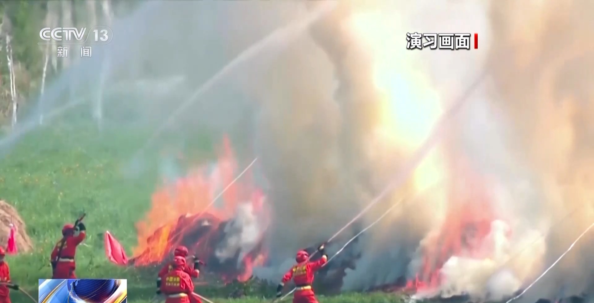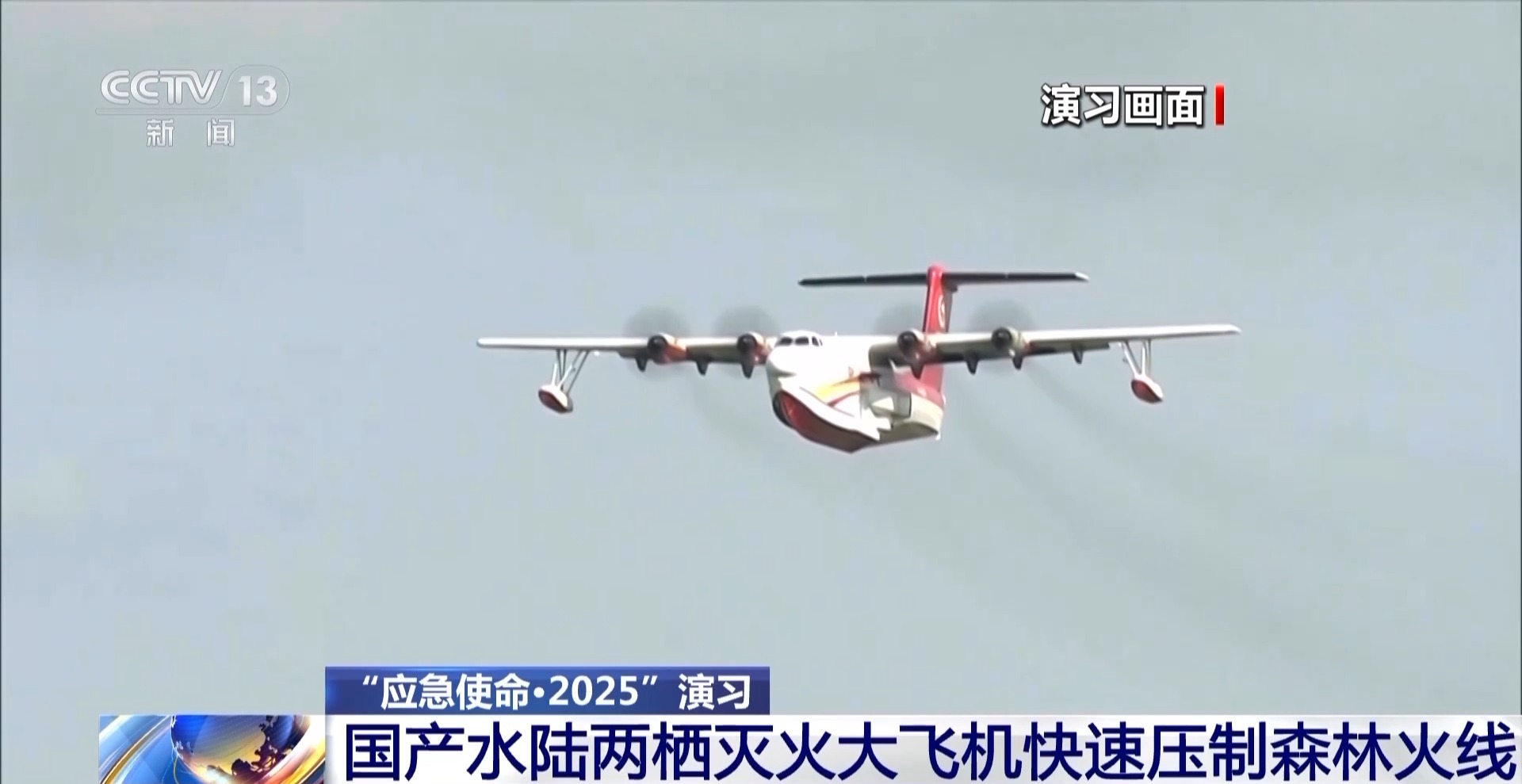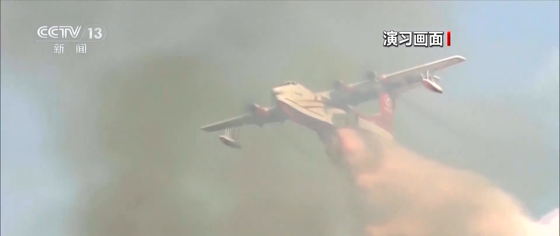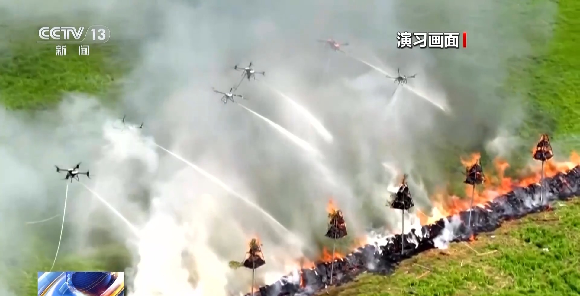 演習中,載着18噸滅火劑的6架飛機飛過火線;直-8直升機拋投噸級滅火彈;具有高效投送、精準滅火能力的“新舟”60固定翼飛機同步灑水滅火;無人機集羣編組通過智能引信和定位技術精準壓制火勢。