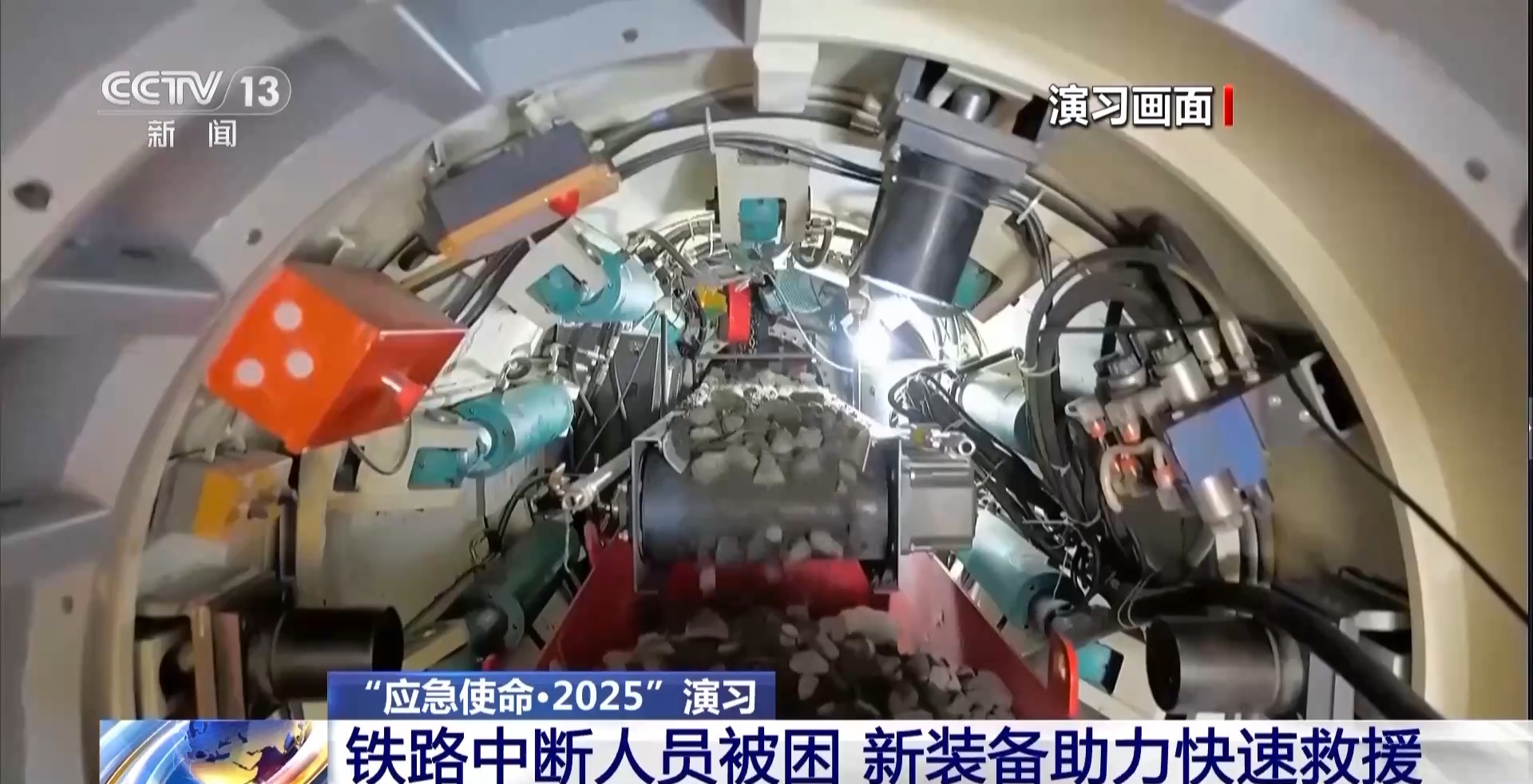 演習中模擬一鐵路隧道洞口坍塌,巡線人員被困。國家隧道應急救援隊伍利用小型救援盾構掘進機開進現場施救。