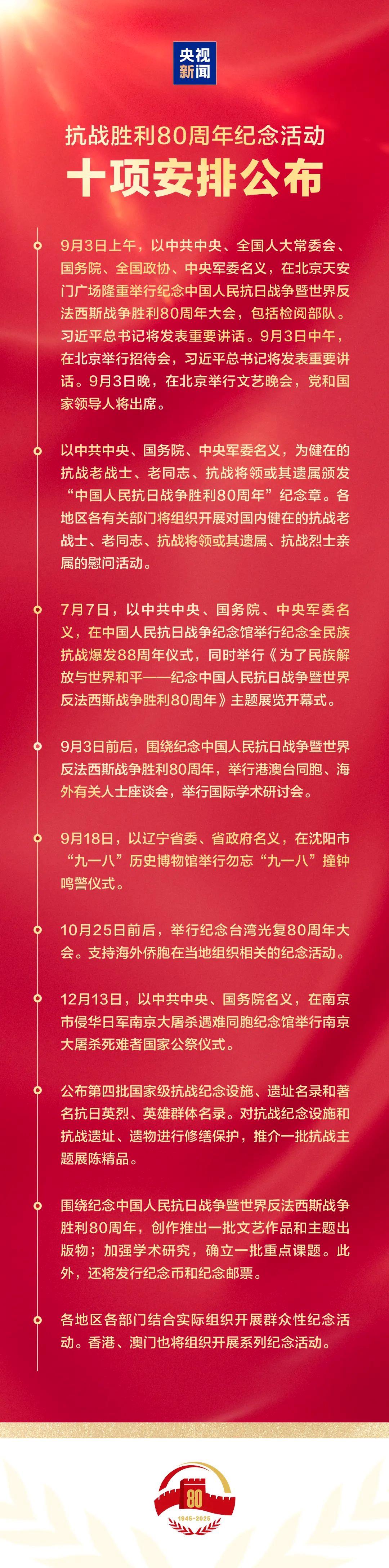 今天上午,國新辦舉行新聞發佈會,介紹了紀念活動總體安排。主要的活動安排,共有十項。習近平總書記將出席紀念中國人民抗日戰爭暨世界反法西斯戰爭勝利80週年大會並發表重要講話。
