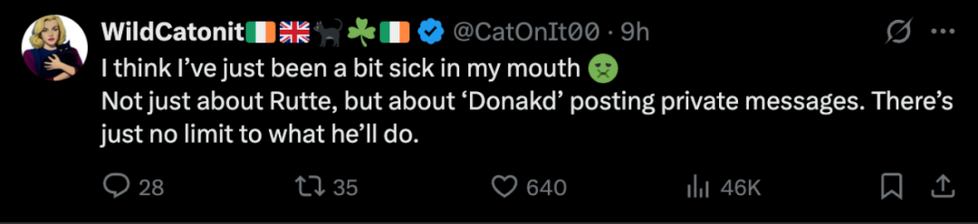 有網友表示,“我感覺有點反胃。不僅僅是因為呂特,還因為‘唐納德’公開私人短信。他的所作所為簡直毫無底線”。