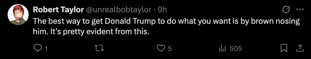 還有網友認為,“讓唐納德·特朗普按你的意願行事的最好辦法就是拍他馬屁。從這件事上就能明顯看出這一點”。