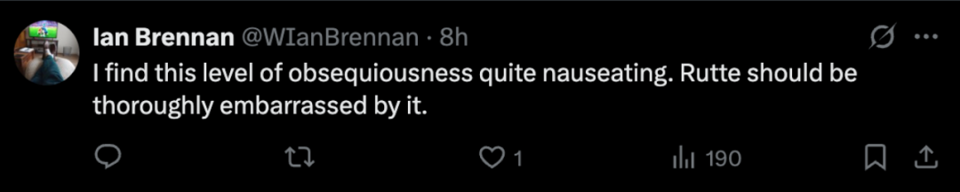 有網友説,“我覺得這種過分的諂媚行為實在令人反感。呂特應該為此感到極其尷尬”。