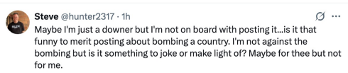 有網友稱,“也許我只是個掃興的人,但我不支持發這種帖子……發一條關於轟炸一個國家的帖子真有那麼好笑嗎?我並不反對轟炸,但這種事可以用來開玩笑或者輕描淡寫嗎?對你來説或許可以,但對我來説不行。”