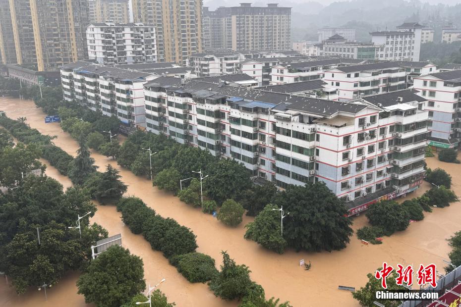 6月23日至24日,貴州省黔東南州榕江縣遭遇持續性強降雨。當前,縣內平永河、寨蒿河、都柳江水位持續快速上漲。圖為6月24日,榕江縣城道路被淹。中新社記者 袁超 攝