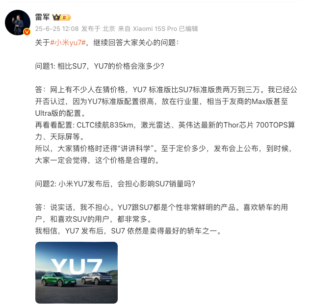 【環球網科技綜合報道】6月25日消息,小米創辦人,董事長兼CEO雷軍就旗下全新車型YU7的定價與市場定位作出回應,明確否認此前網絡流傳的“YU7標準版比SU7標準版貴2萬至3萬元”的説法,並強調YU7的高配置將使其在行業中與友商的Max版甚至Ultra版車型對標。