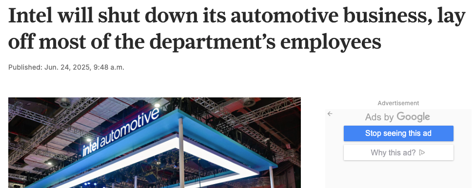 【環球網科技綜合報道】6月25日消息,據外媒報道,英特爾(Intel)將逐步關閉其小型汽車業務部門(Intel Architecture Automotive Group),並裁撤該領域“大多數”員工。這一舉措是英特爾近期大規模裁員與業務重組計劃的最新動作,旨在加速成本削減並聚焦核心芯片業務。