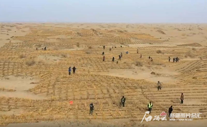 2月10日,若羌縣國道218線旁的固沙工程施工現場,工人們正在扎草方格。圖/若羌縣融媒體中心提供
