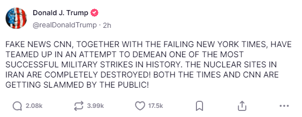 空襲過去三天了,特朗普的社交媒體賬號內容還是“徹底摧毀”言論刷屏。美國官員和媒體宣稱“徹底摧毀”伊朗核設施的言論被他一條接一條轉發,他還在一條聲明裏用全大寫字母強調,CNN和《紐約時報》都是“假新聞”,空襲伊朗是“歷史上最成功的軍事打擊之一”。