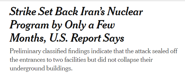 《紐約時報》也報道説,美軍的打擊僅封住了兩個核設施的入口,並沒有摧毀其地下建築。伊朗核項目發展或將延遲,但預計延遲時間不會超過6個月。