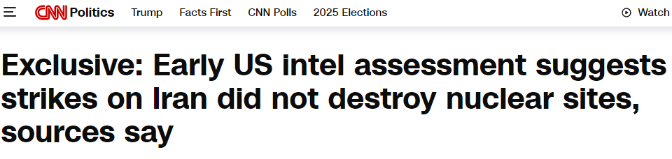 據美國有線電視新聞網報道,三位知情人士描述的一份美國早期情報評估報告顯示,*此前美國對伊朗三處核設施的軍事打擊並未摧毀伊朗核計劃的核心部件,可能僅使其核計劃推遲了數月。*其中一位知情人士稱,該報告基於美國中央司令部在美國空襲後進行的戰鬥損失評估。
