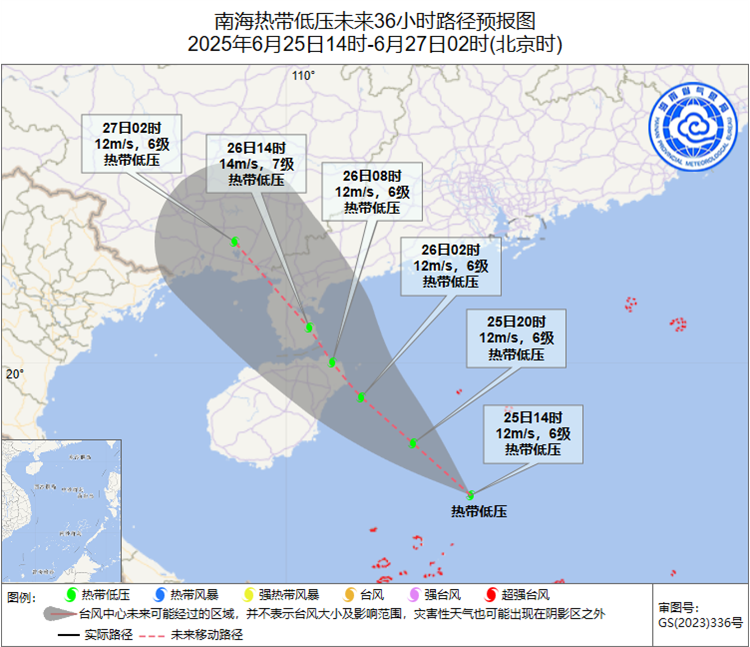 海南省氣象局6月25日14時45分發布颱風四級預警:原位於南海中部的熱帶擾動已於25日14時生成熱帶低壓,其中心位於北緯17.7度、東經113.2度,也就是距離海南省三沙市(西沙永興島)東北方向約130公里海面上,中心附近最大風力6級(12米/秒),中心氣壓1004hPa。