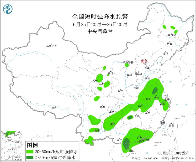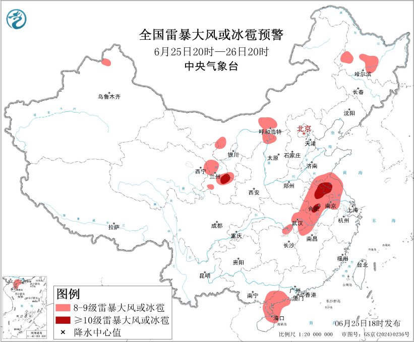 預計6月25日20時至26日20時,黃淮東部、江淮東部、江漢東部、西北地區東部、華南南部等地的部分地區將有8級以上雷暴大風或冰雹天氣,其中,江蘇北部、安徽中北部、甘肅中部等地的部分地區將有10級以上雷暴大風,最大風力可達11級以上,局地不排除出現龍捲的可能性;黃淮、江淮、江漢、西南地區東部、華南等地的部分地區將有小時雨量大於20毫米的短時強降水天氣,其中,安徽中部、江蘇中北部、湖南中西部、廣西東南部、廣東西南部等地的部分地區小時雨量大於50毫米,最大可達70毫米以上。