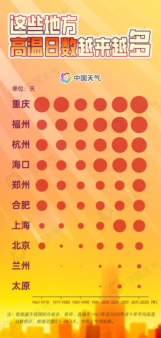 統計近60年氣温數據發現,不少城市高温日數總體呈增多的趨勢,雖然有些地方部分年代略有波動,但從20世紀70、80年代至今,多個城市的高温日數在明顯增加。