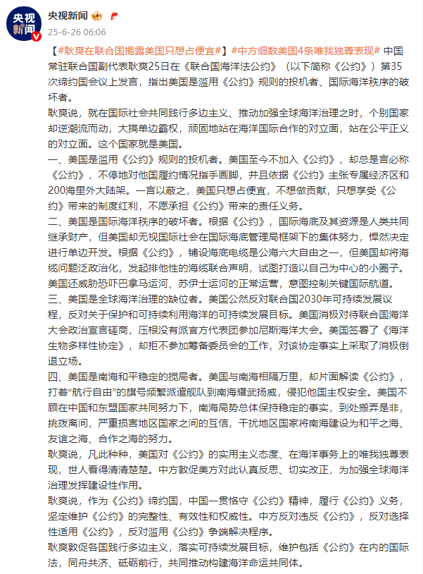 【耿爽在聯合國揭露美國只想佔便宜】中國常駐聯合國副代表耿爽25日在《聯合國海洋法公約》(以下簡稱《公約》)第35次締約國會議上發言,指出美國是濫用《公約》規則的投機者、國際海洋秩序的破壞者。