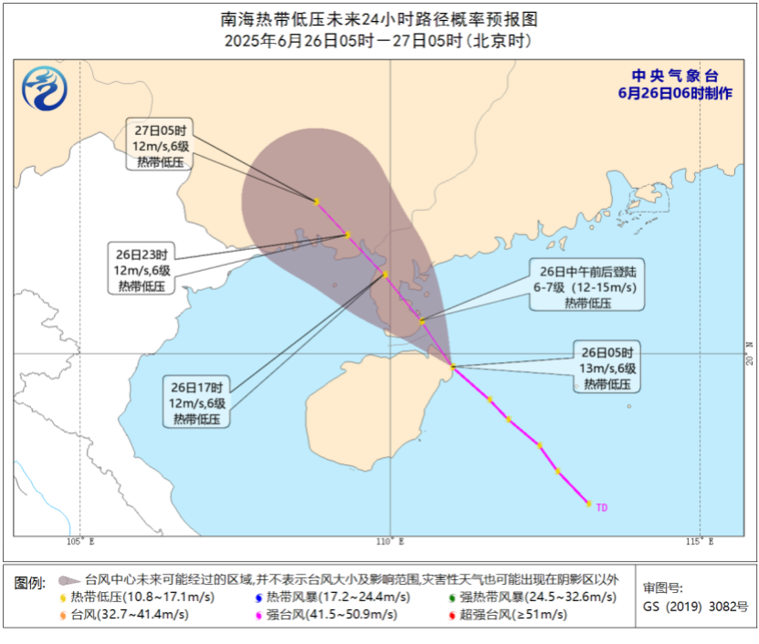 今晨,南海熱帶低壓在海南省文昌市翁田鎮沿海登陸。預計,該低壓將以每小時15~20公里的速度向西北方向移動,強度變化不大,將於今天中午前後在廣東湛江一帶沿海再次登陸(熱帶低壓,6~7級,12~15米/秒),登陸後強度逐漸減弱。