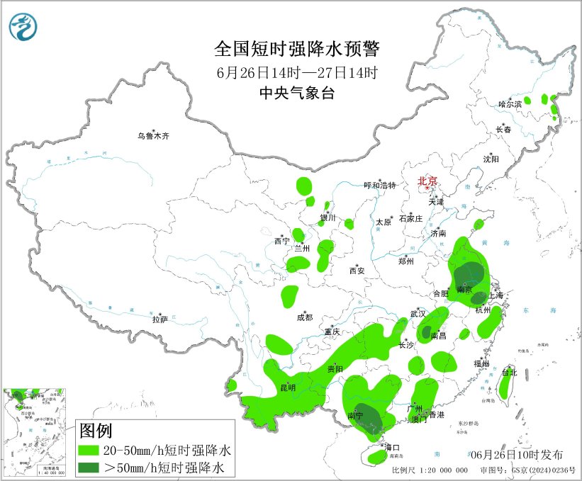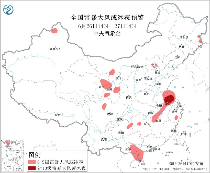 預計6月26日14時至27日14時,黃淮、江淮、華南南部、西北地區等地的部分地區將有8級以上雷暴大風或冰雹天氣,其中,安徽東部、江蘇中部等地的部分地區將有10級以上雷暴大風,最大風力可達11級,安徽東部、江蘇中部局地不排除出現龍捲的可能性;江淮、黃淮、江南、西南地區、華南、西北地區等地的部分地區將有小時雨量大於20毫米的短時強降水天氣,其中,安徽東部、江蘇中南部、浙江北部、江西北部、廣西南部、廣東西南部等地的部分地區小時雨量大於50毫米,最大可達70毫米以上。
