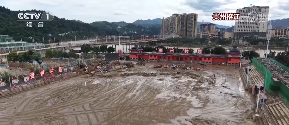 在本輪強降雨天氣過程中,貴州省榕江縣內三條河流河水猛漲並出現了倒灌,貴州“村超”球場也被洪水侵襲。因為“村超”球場地勢低窪又挨着都柳江,所以一度積水嚴重。隨着洪水退去,當地組織力量進行清淤。