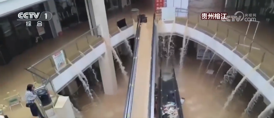 受持續強降雨和上游來水影響,貴州榕江縣和從江縣24日先後經歷洪峯過境,縣城多地被淹。有居民在社交平台發佈了一段榕江縣最大商城被淹的視頻。視頻中,商場內部,水沿着電梯向下流,一樓商鋪被淹沒了一半多。據瞭解,在洪水到來前,為了保證員工們的安全,商場全體人員已經被安全撤離。