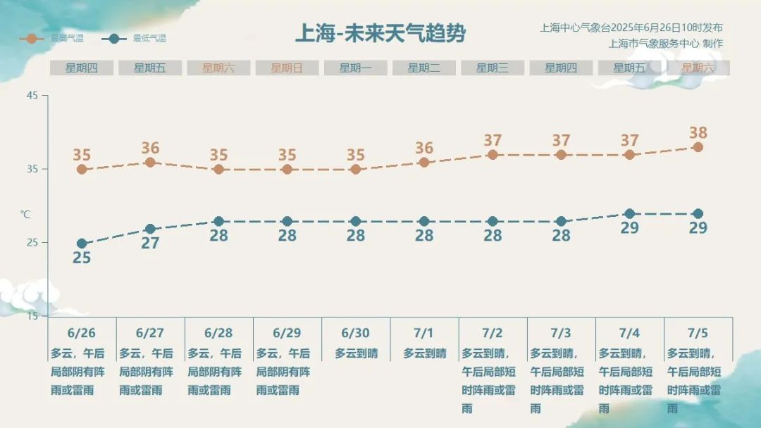 週五和雙休日上海持續高温天氣。明天氣温更高,風向以西南風為主,午後更容易出現陣雨或雷雨。週六和週日主要處在副熱帶高壓邊緣,具有一定不穩定條件,* 午後也將有雷陣雨可能。外出請及時留意最新的預報預警信息*。