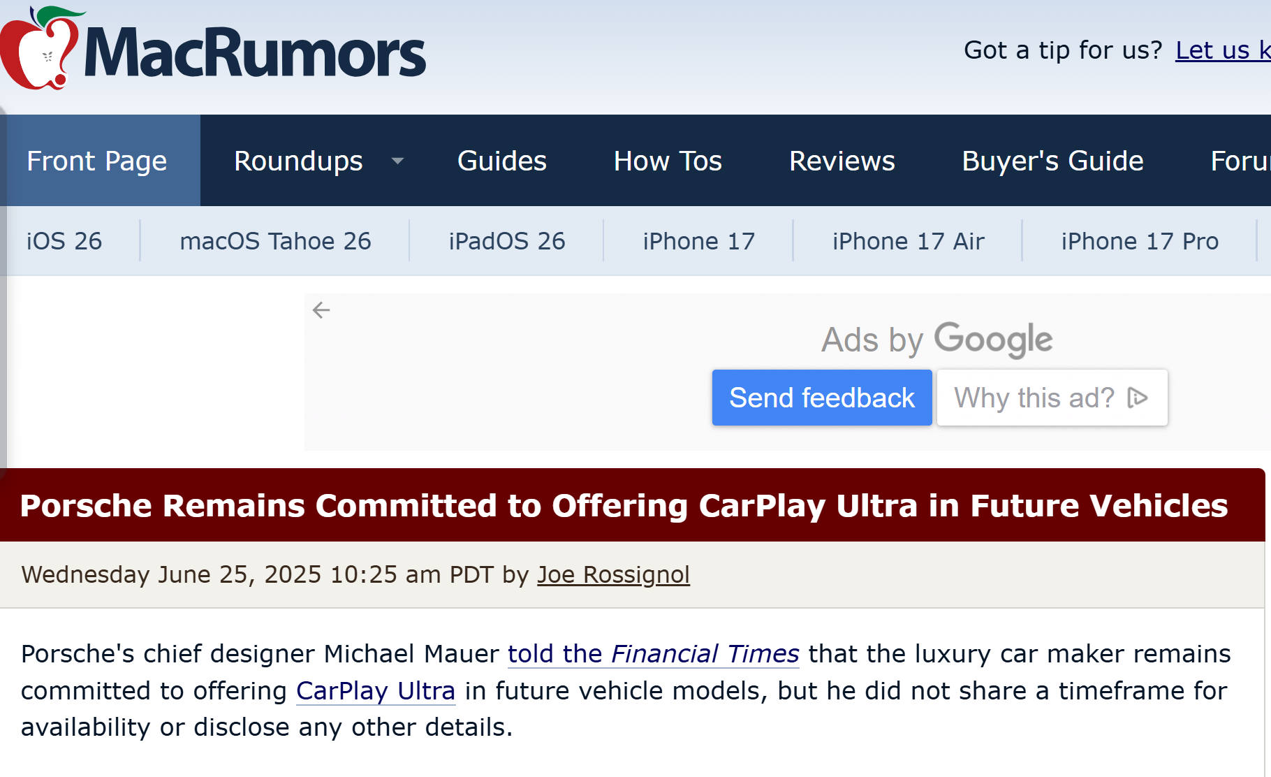 【環球網科技綜合報道】6月26日消息,據外媒報道,保時捷首席設計師邁克爾・毛爾近日明確表示,未來推出的保時捷車型將繼續提供對蘋果CarPlay Ultra功能的支持。不過,目前保時捷尚未對外公佈具體的應用時間表以及相關細節內容。