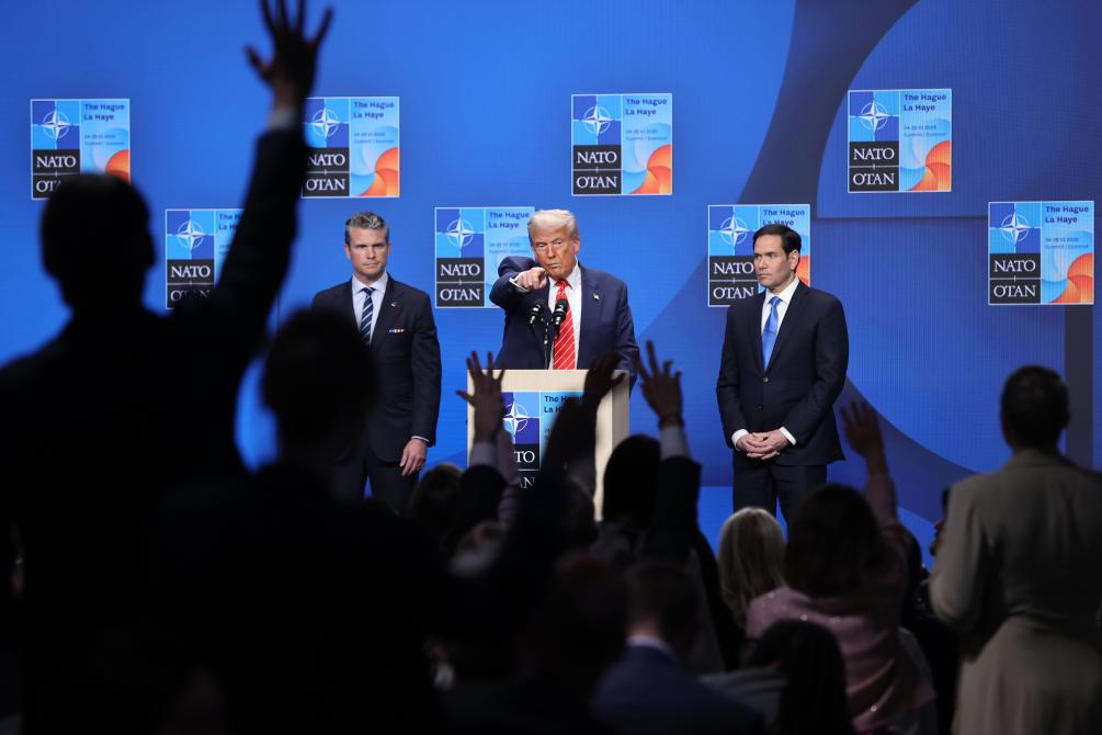 6月25日,在荷蘭海牙,美國總統特朗普(中)在北約峯會後出席記者會。新華社記者趙丁喆攝