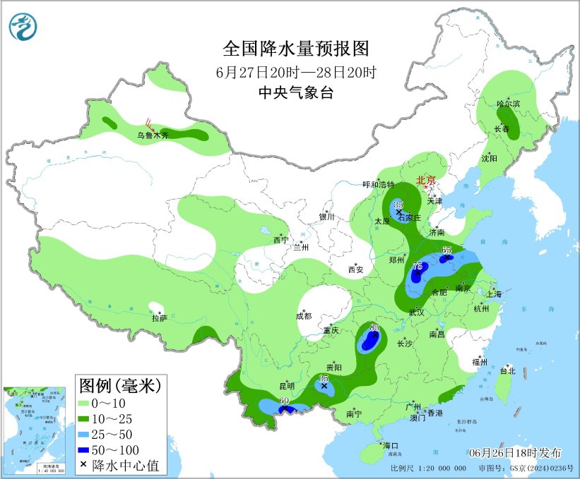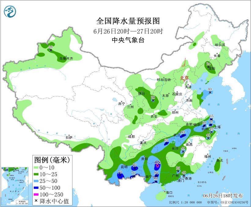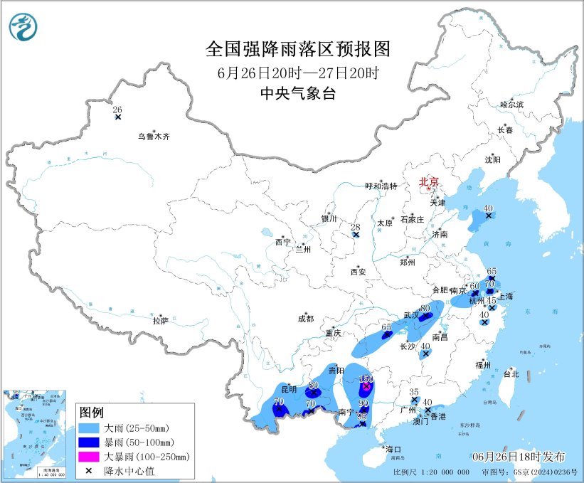 26日夜間至27日,廣西、西南地區東部和南部、江南北部、江漢、黃淮等地有較強降水,部分地區有大到暴雨。預計,6月26日20時至27日20時,廣西、雲南中南部、貴州東北部和南部、湖南北部、湖北東部、江西北部和西部、安徽南部、江蘇南部、上海、山東半島等地的部分地區有大到暴雨,其中,廣西北部等地局部地區有大暴雨(100~150毫米)(見圖1)。上述部分地區伴有短時強降水(最大小時降雨量20~40毫米,局地可超過50毫米),局地有雷暴大風等強對流天氣。中央氣象台6月26日18時發佈暴雨**藍色預警。