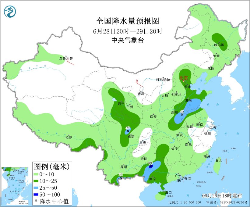 *6月28日20時至29日20時,*青海東部、甘肅南部、北京、天津、山東大部、河南東部、蘇皖北部、湖南西部、四川中部、雲南南部以及廣西大部等地部分地區有中到大雨,其中,廣西北部局地有暴雨(50~60毫米)(見圖5)。