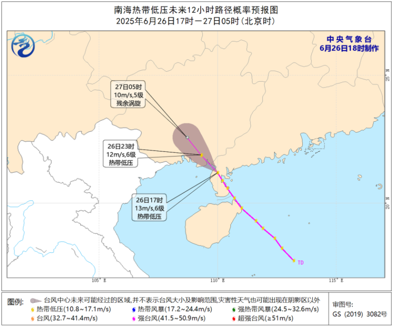 南海熱帶低壓的中心今天(6月26日)下午5點位於廣東省湛江市遂溪縣境內,就是北緯21.2度、東經110.0度,中心附近最大風力6級(13米/秒),中心最低氣壓為998百帕。預計,該低壓將以每小時15-20公里的速度繼續向西北方向移動,並將於今天晚上經由北部灣海面在廣西東南部沿海再次登陸,也有可能由廣東湛江陸地移入廣西境內,強度逐漸減弱(見圖2)。6月26日20時至27日20時,南海西北部、北部灣、瓊州海峽、廣東中西部沿海、海南島沿海、廣西沿海將有5-6級風,部分海域或地區陣風可達7-8級。