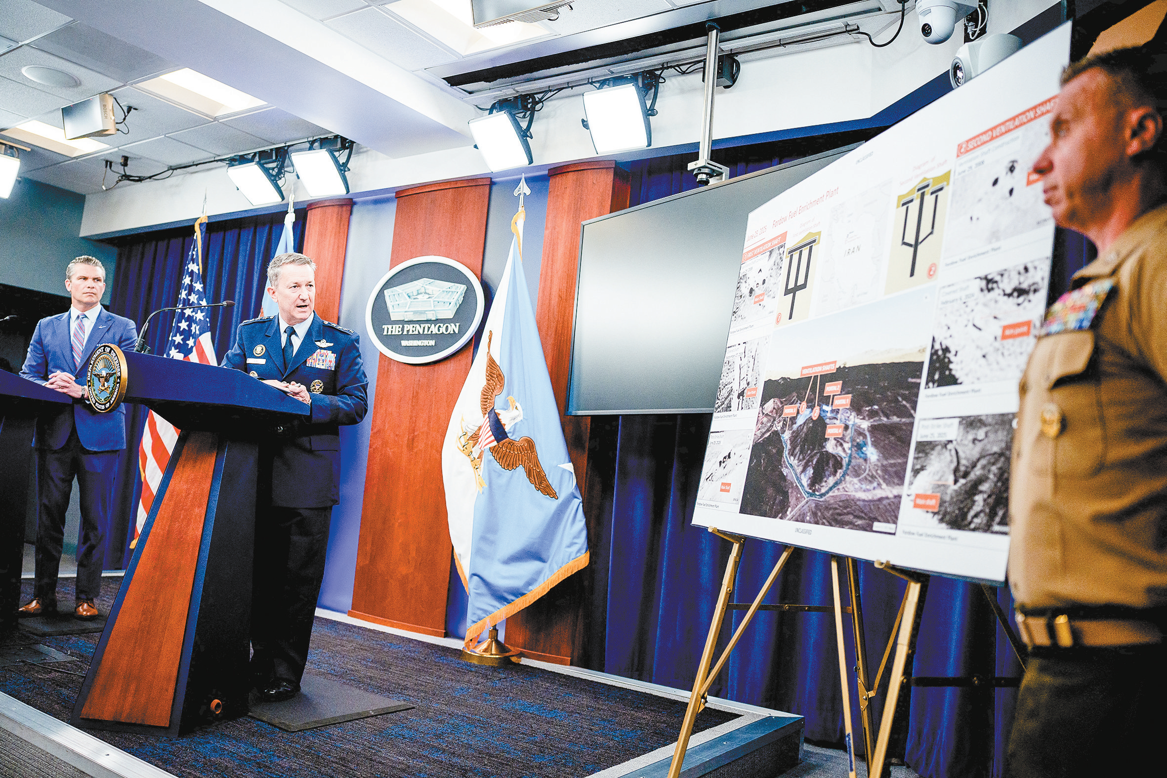 【環球時報駐美國特約記者 蕭達 線一凡 於文】當地時間26日上午8時,美國國防部長赫格塞思、參謀長聯席會議主席凱恩在五角大樓舉行記者會,力證總統特朗普的一個説法:美國21日的軍事打擊“徹底摧毀了”伊朗核設施。赫格塞思批評美國媒體先前的報道,強調這次行動“大獲成功”。連日來,圍繞這場空襲對伊朗核設施造成的損壞程度,美國國內爆發激烈爭吵,並發展成一場政治鬥爭。特朗普稱,這場記者會是為了“捍衞美國飛行員的尊嚴”,執行這次襲擊任務的飛行員對媒體的報道和情報評估感到震驚,感覺糟透了。另一邊,伊朗最高領袖哈梅內伊26日發表電視講話稱,美國人“誇大了”美方空襲對伊朗核設施的影響,並“淡化了”伊朗襲擊對美國駐卡塔爾軍事基地的損害。美國從這場戰爭中並沒有取得任何成果,伊朗取得了勝利,並狠狠地給了美國一記耳光。
